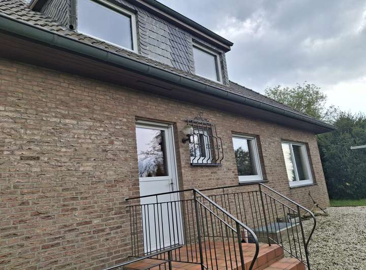 Die Fenster wurden 2012 erneuert (Dreifachverglasung), (Ausnahme Badfenster), und sind mit Rollläden versehen (teils elektrisch). Gleichzeitig wurden eine neue Haustür zum hinteren Garten und drei Velux-Dachflächenfenster eingebaut, zwei davon mit Außenrollläden. Böden gefliest oder Holzparkett. In den Schlafräumen liegt neues Laminat. In der Küche Linoleum.