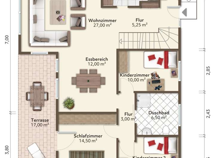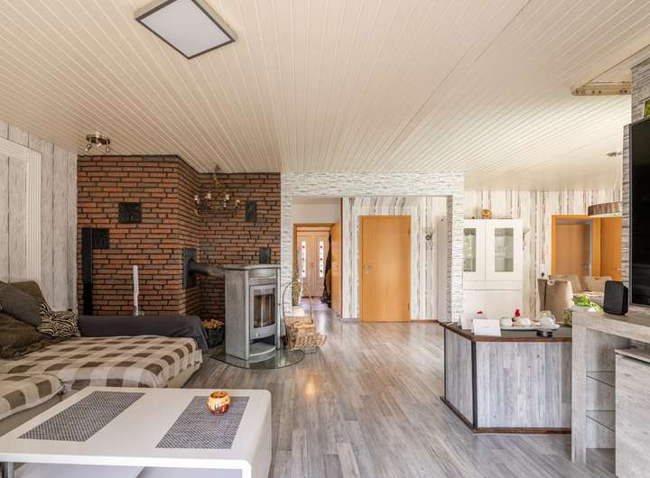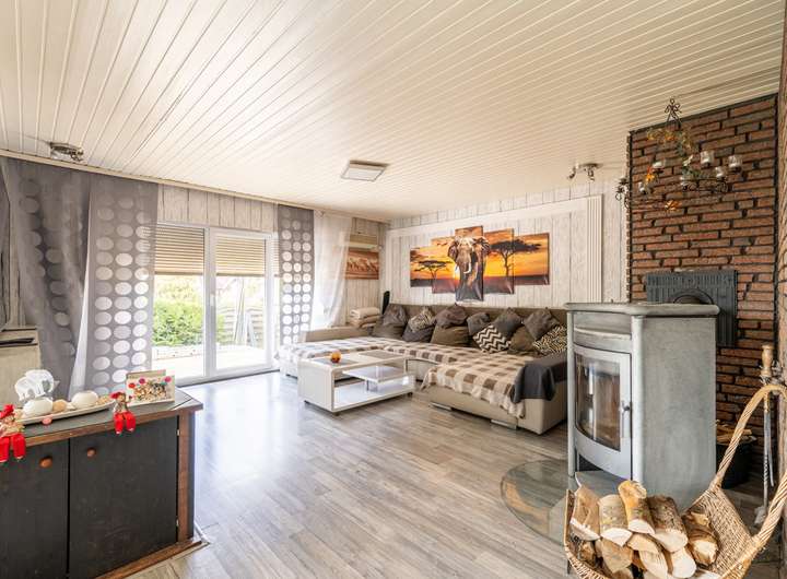 Das einladende Zuhause bietet insgesamt 6,5 Zimmer, darunter zwei stilvolle Badezimmer, die Komfort und Bequemlichkeit für die ganze Familie gewährleisten. Das Herzstück des Hauses bildet das Wohnzimmer mit einem eleganten Kamin, der an kühleren Tagen für eine warme und gemütliche Atmosphäre sorgt. Die integrierte Klimaanlage bietet zudem ein angenehmes Raumklima zu jeder Jahreszeit.