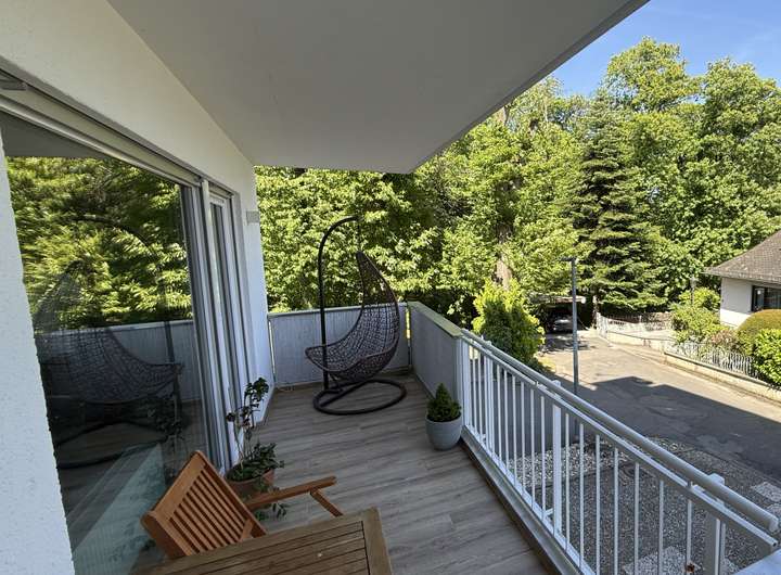 Den Balkon, der sich über die gesamte Breite der Wohnung erstreckt, erreichen Sie ebenfalls über den Wohnbereich. Genießen Sie hier Ihren Morgenkaffee mit der Sonne im Gesicht.