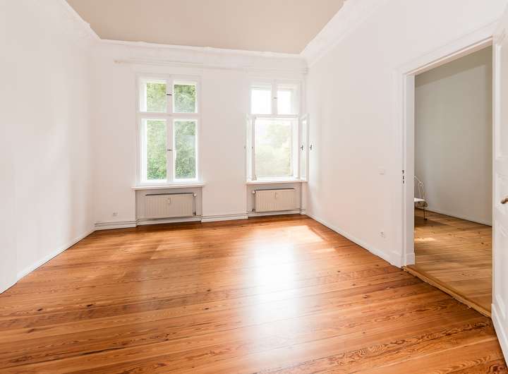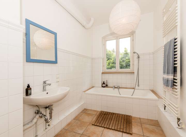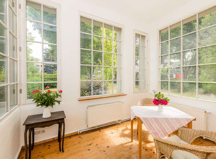 Das Erdgeschoss beherbergt eine 4-Zimmer-Wohnung, die mit zahlreichen original erhaltenen Stilelementen wie Stuck, Dielenböden, Doppelkastenfenstern sowie originalen Türen und Beschlägen, originalen Fliesen und einem alten Holzofen beeindruckt. Diese Elemente, kombiniert mit einer großzügigen Deckenhöhe, verleihen der Wohnebene eine repräsentative und einladende Atmosphäre. Sie eignet sich hervorragend als Gemeinschaftsfläche für eine Familie oder als Repräsentanz für Ihr Business, wie z.B. eine Kanzlei, Stiftungs- oder Schulungsräume. Ein ca. 12 Quadratmeter großer Wintergarten erweitert den Wohnbereich und bietet einen fantastischen Ausblick in den reich mit Bäumen, Blumen, Sträuchern und Gräsern bestückten Garten.