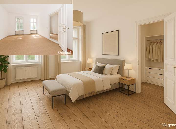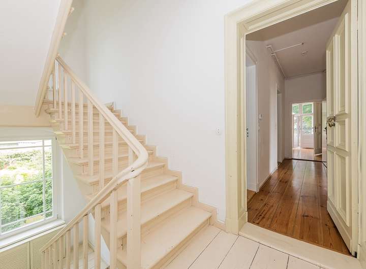 Über eine zentrales Treppenhaus gelangen Sie in das 1. Obergeschoss. Der Grundriss ist nahezu identisch mit dem Erdgeschoss, bietet jedoch anstelle des Wintergartens einen großzügigen Balkon. Auch hier sind originale Türen und Beschläge, Dielenböden und altbautypische Doppelkastenfenster wie auch Stuck einigen Zimmern erhalten.