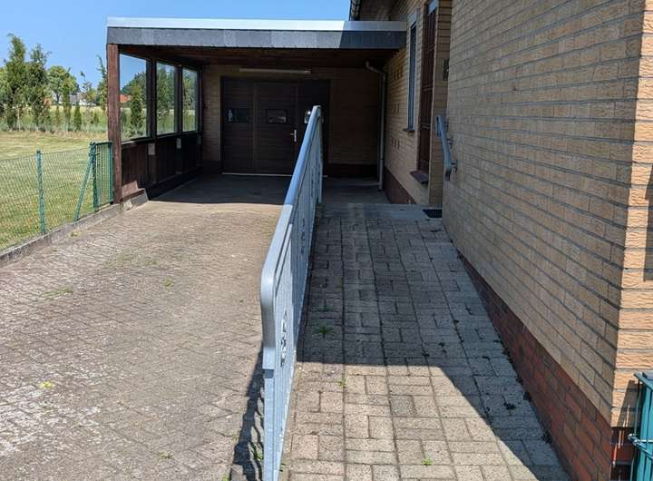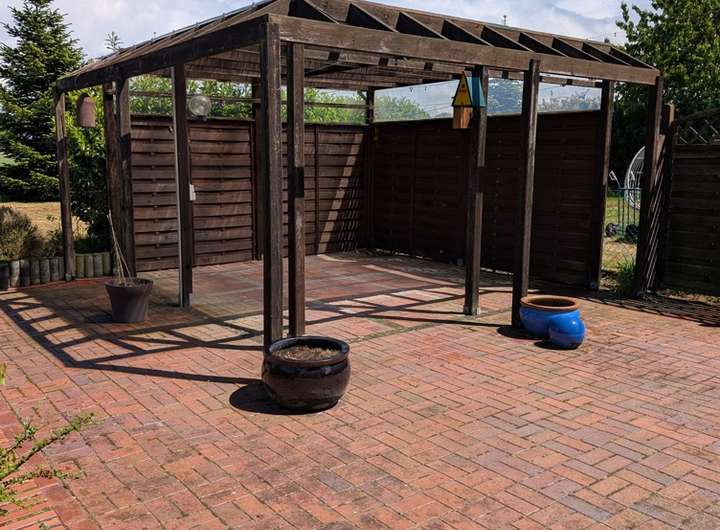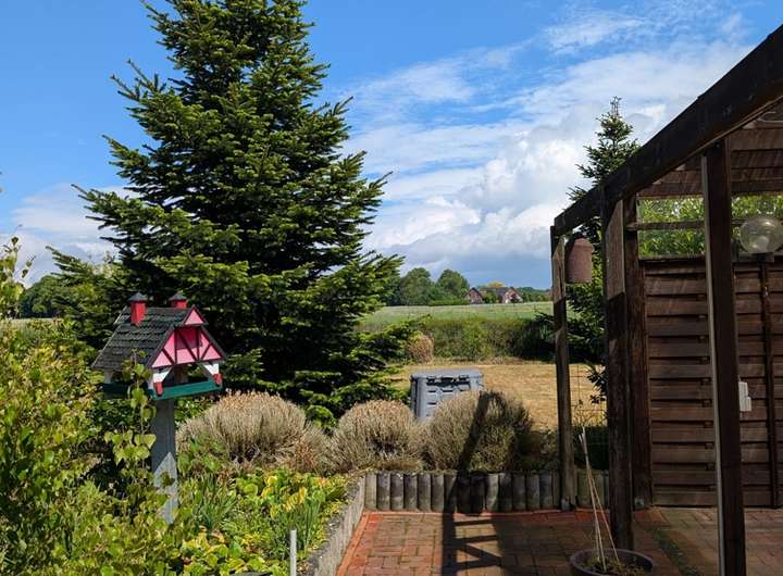 Zusätzlichen Zugang in den Garten und zu einer Terrasse die mit einem festem Holzpavillon überdacht ist bietet Ihnen auch ein kleiner Flur neben der Küche. Garten und Terrassenbereich laden Sie zum gemeinsamen Grillen, Spielen oder Entspannen ein.