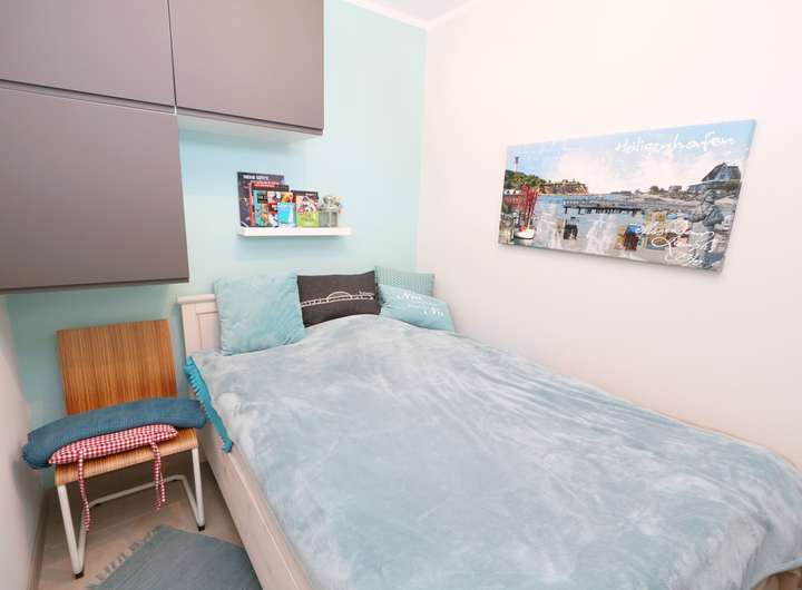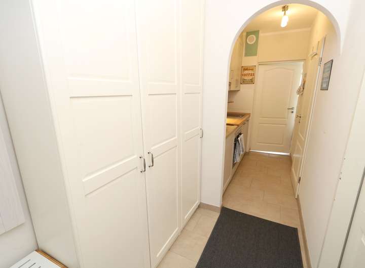 Schon beim Betreten der Wohnung empfängt Sie ein freundlicher Flur mit ausreichend Platz für eine Garderobe. Direkt rechter Hand gelangen Sie in das geschmackvoll eingerichtete Gäste- bzw. Kinderzimmer – ideal für Besucher oder als praktischer Rückzugsort. Ebenfalls vom Flur aus erreichen Sie das modern gestaltete Duschbad, das mit zeitloser Eleganz überzeugt. Die neuwertige Pantry-Küche fügt sich harmonisch in den Flurbereich ein und bietet alles, was man für die Zubereitung aller Mahlzeiten benötigt.