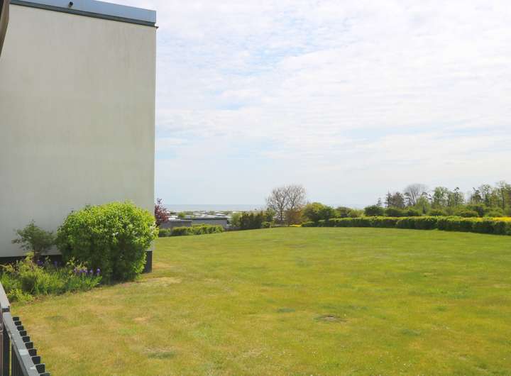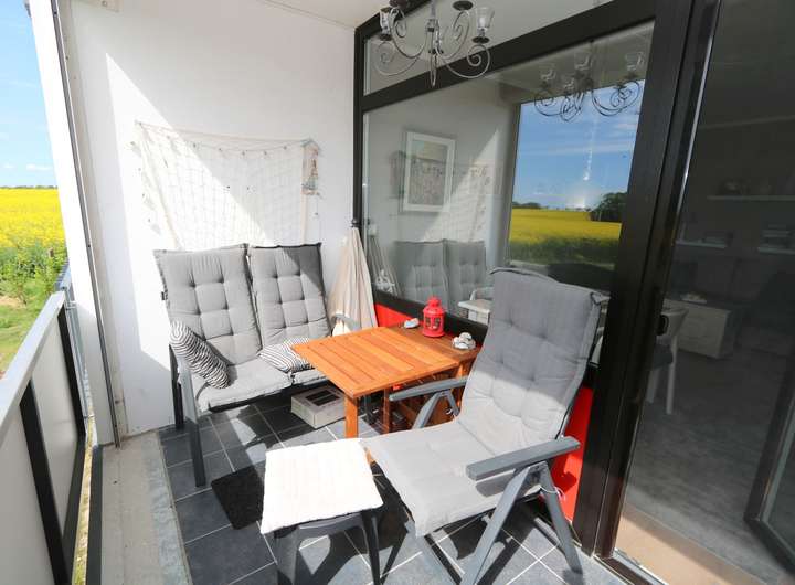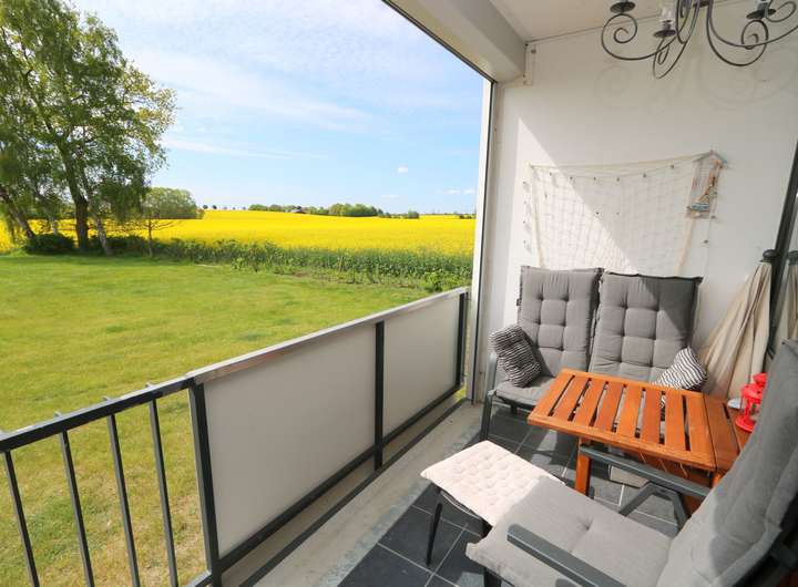 Ein besonderes Highlight dieser Wohnung ist der überdachte, nach Süden ausgerichtete, Balkon mit elektrischer Außenjalousie. Diese ermöglicht es, den Balkon komplett zu verschließen, sodass er sich hervorragend als geschützter Abstellraum eignet – ideal für Balkonmöbel oder andere Gegenstände, die wettergeschützt gelagert werden sollen. Gleichzeitig bleibt der fantastische Blick über die Landschaft bis zur Ostsee erhalten – perfekt für entspannte Stunden an der frischen Luft.