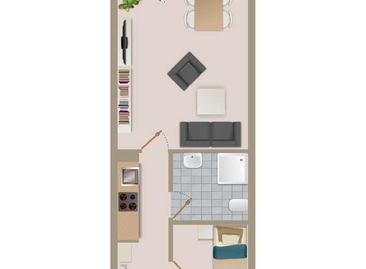 Das helle Wohn- und Schlafzimmer besticht durch seine durchdachte Raumaufteilung und stilvolle Gestaltung. Hier finden sowohl ein gemütlicher Essbereich als auch ein komfortabler Schlafbereich problemlos Platz. Große Fenster lassen viel Tageslicht herein und schaffen eine angenehme Wohnatmosphäre.