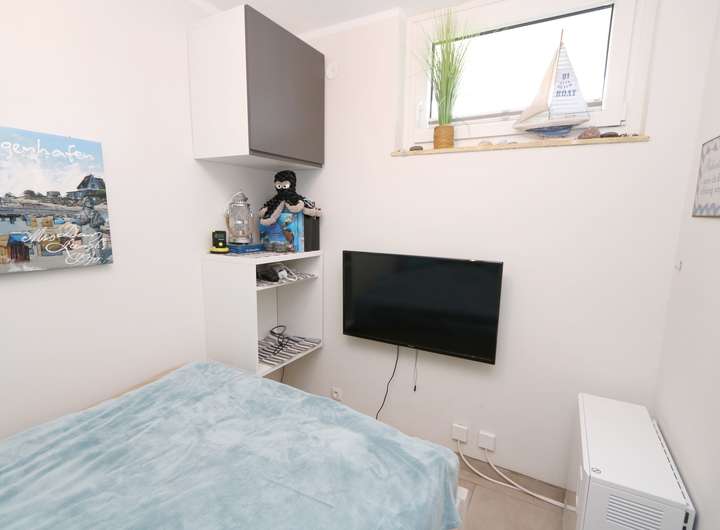 Ein besonderes Highlight ist die überdachte Loggia mit elektrischer Außenjalousie – ideal zum Sonnenbaden oder als geschützter Stauraum nutzbar. Das hochwertige Schlafsofa im Wohnbereich kombiniert Komfort mit Flexibilität, während das zweite Zimmer ideal als Gäste- oder Kinderzimmer dient. Dank des optimierten Grundrisses und zusätzlicher Einbauschränke wirkt die Wohnung überraschend großzügig.