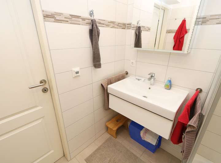 Wohlige Wärme garantieren eine Fußbodenheizung, sowie moderne Nachtspeicheröfen. Die Fußbodenheizung ist im Kinderzimmer, im Bad und im Flur. Ein edler Designer-Vinylboden im Wohnbereich sorgt gemeinsam mit den Fliesen in den anderen Räumlichkeiten für eine pflegeleichte und moderne Wohnatmosphäre.
