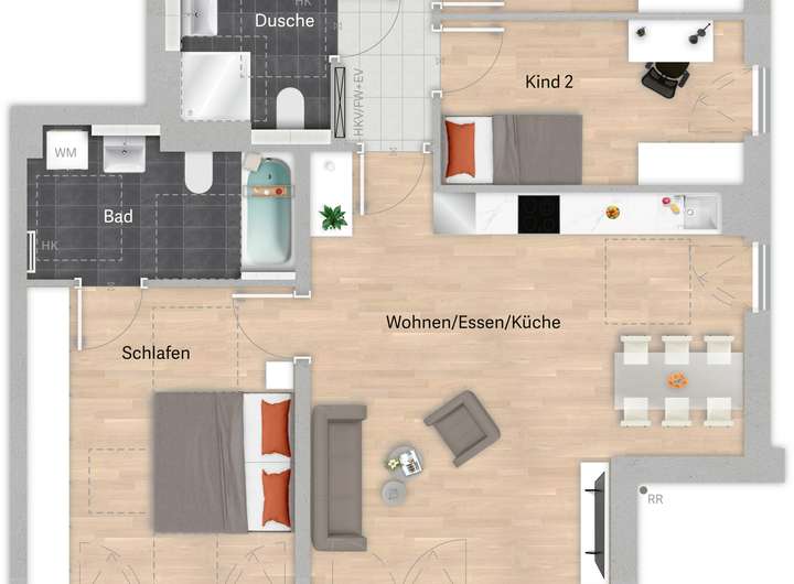 Zwei gleich große Kinderzimmer und die zentrale Diele mit Abstellfläche sorgen für eine ausgewogene Raumaufteilung. Ergänzt wird die Ausstattung durch ein weiteres Bad mit bodenebener Dusche – ideal für Familien oder Wohnen mit Gästen.