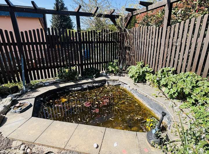 Zur Immobilie gehört ein kleiner Teich und eine Einzelgarage mit Grube, sowie Stellplätze vor der Garage.