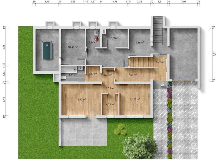 So lässt sich das Haus als großzügiges Einfamilienhaus, oder aber auch als Wohnhaus auf einer Ebene mit zusätzlicher Einliegerwohnung im unteren Bereich bewohnen.