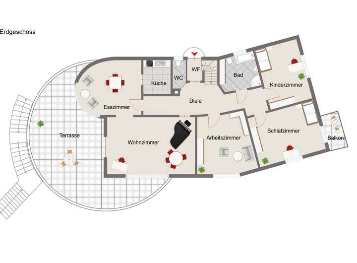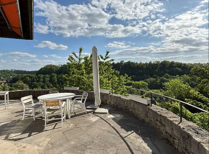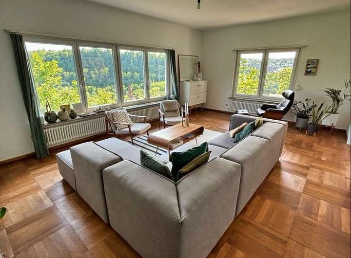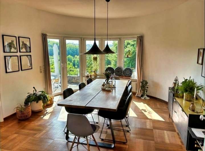 Das Haus bietet durch seine Aufteilung vielseitige Nutzungsmöglichkeiten: Im Erdgeschoss befindet sich eine großzügige Wohnung mit einer beeindruckenden runden Aussichtsterrasse. Die Wohnung im Gartengeschoss ist über einen separaten Zugang erschlossen und kann deshalb sehr gut vermietet werden. Sie ist zusätzlich über eine massive Eichentreppe innerhalb des Gebäudes zugänglich. Ein Zusammenlegen der beiden Wohnungen ist deshalb einfach möglich. Das Gartengeschoss eignet sich auch hervorragend für ein Büro oder Atelier jeglicher Art. Das Dachgeschoss wird aktuell als Hobbyraum genutzt - die Raumhöhe lässt den individuellen Ausbau auch zu Wohnraum zu.