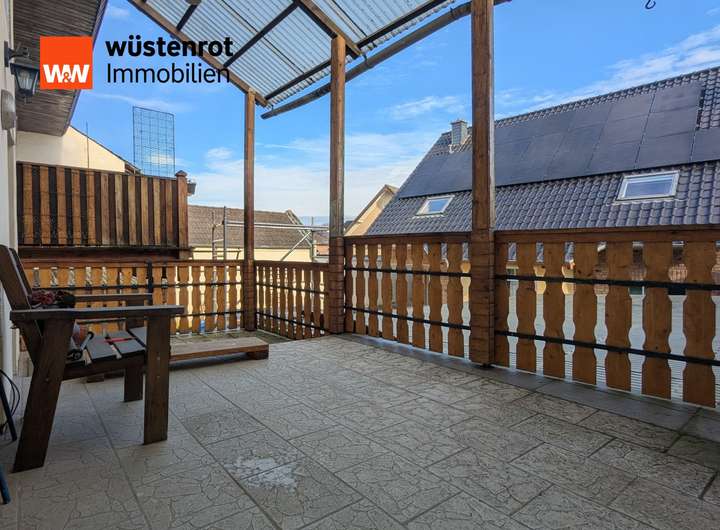 Obergeschoss: Zwei weitere Schlafzimmer, große Terrasse zur Hofseite mit viel Platz für Erholung.