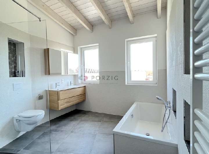 Das edle Masterbad ist ein echtes Wohlfühl-Highlight: Badewanne, bodengleiche Dusche, Bidet, Doppelwaschtisch, Handtuchheizkörper und ein praktischer Waschmaschinenanschluss bieten Ihnen alles, was Sie für einen entspannten Start in den Tag brauchen.