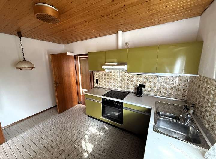 - im Erdgeschoss die Küche mit Durchgang in den großzügigen Wohn-/Essbereich mit Kaminofen sowie mit Zutritt zur Terrasse.