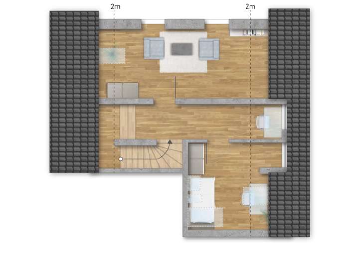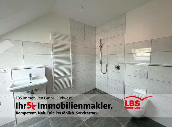 Im Dachgeschoss befindet sich ein weiteres großes Zimmer inklusive einer Ankleide, durch die das zweite Tageslichtbadezimmer mit bodentiefer Dusche betreten werden kann.