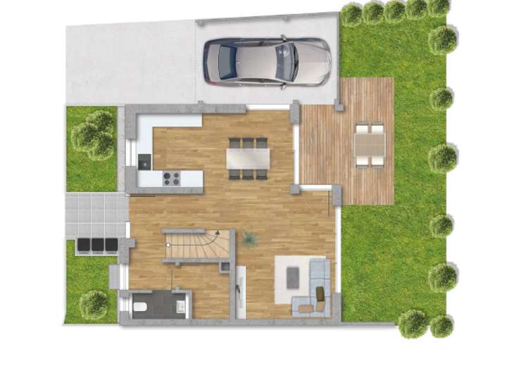 Im Erdgeschoss befindet sich der großzügige Wohn-/ Essbereich. Durch die bodentiefen Fenster ist diese Etage lichtdurchflutet und lädt zum gemeinsamen Verweilen ein.