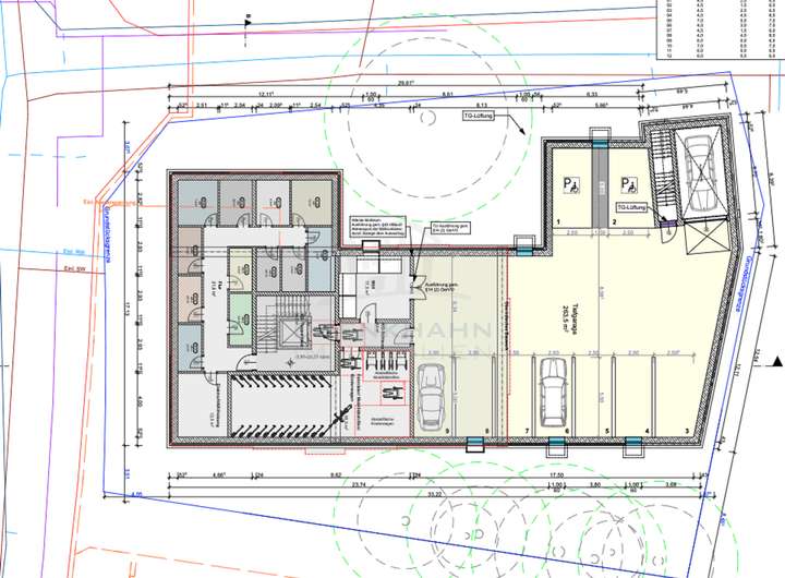 Die Tiefgarage ist funktional ergänzt um Abstellräume, Technikflächen sowie separate Fahrradabstellflächen.