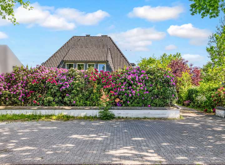 Das sichtgeschützte Grundstück wird über eine lange, private Einfahrt erschlossen, die nicht nur zusätzliche Privatsphäre schafft, sondern auch Platz für mehrere Fahrzeuge bietet.