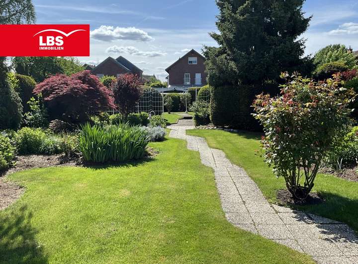 Garten: liebevoll angelegt mit Zierbepflanzung, Rasenflächen und geschwungenen Wegen