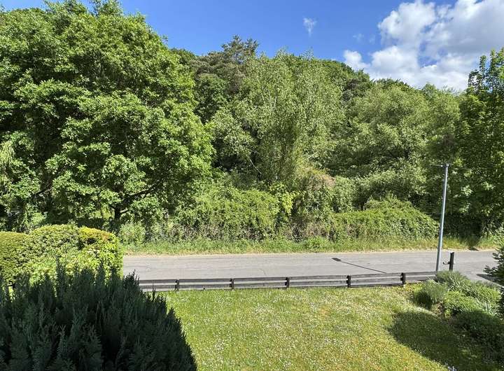 Im Obergeschoss befindet sich die klassische Wohnebene mit einer großzügigen zentralen Diele, von der aus alle Räume dieser Etage bequem zugänglich sind. Der Wohn- und Essbereich öffnet sich über eine breite Schiebetür zur Terrasse mit Blick in den gepflegten Garten. Die Küche ist separat gehalten, kann auf Wunsch jedoch offen in den Wohnbereich integriert werden. Zwei weitere Zimmer – ideal als Elternschlafzimmer sowie Kinderzimmer oder Arbeitsraum – bieten einen traumhaften Blick ins Grüne und liegen angenehm zurückgezogen. Ein gepflegtes Tageslichtbad mit Wanne und Dusche sowie ein separates Gäste-WC ergänzen das Raumangebot.
