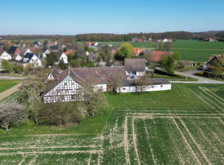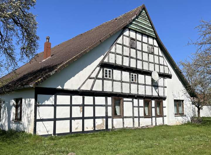 Dieser sanierungsbedürftige Resthof mit Stallungen sucht Sie ab sofort als neuen Eigentümer. Erbaut wurde ihr zukünftiges Zuhause um 1837 (KEIN DENKMAL) in Fachwerkbauweise. ca. 1966 erfolgten Anbauten am Haus und der Anbau des Kuhstalls. Die Grundstücksgröße beläuft sich auf stolze 2.936 m². Optional können noch ca. 800 qm rechts vom Haus nach Absprache gegen einen Aufpreis erworben werden. Das reine Wohnhaus umfasst eine Wohnfläche von ca. 132 m² und teilt sich wie folgt auf: Von der Diele und vom Garten aus gelangen Sie in das Wohnhaus. Hier erreichen Sie über einen zentralen Flur alle Räume. Das Badezimmer mit Dusche und Wanne, 3 Schlafzimmer, ein Wohnzimmer, die Küche und die ehemalige Waschküche. Die Holzfenster sind zum Großteil aus 1989. Beheizt wird das Wohnhaus über Nachtspeicheröfen. Das Wohnhaus befindet sich in einem sanierungsbedürftigem Zustand und wartet darauf, dass Sie hier all Ihre Wohnträume verwirklichen.