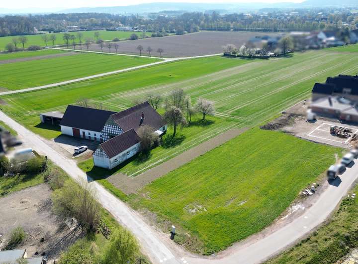 Werfen wir einen Blick in den Garten. Der Resthof ist umgeben von einer Wiese mit kleinem Baumbestand und Feldern mit Weitblick. (Der Acker drumherum steht NICHT zum Verkauf). Angrenzend an Ihrem neuen Zuhause entsteht ein kleines Baugebiet. Der Resthof befindet sich allerdings im Außenbereich - Idylle pur !