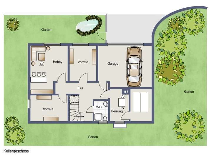 - Leichte Hanglage mit ebenerdigem Zugang zum Kellergeschoss