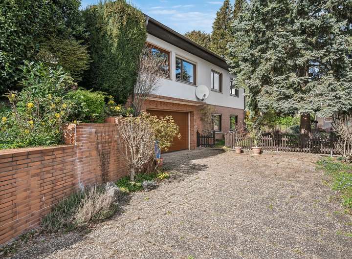 Dank der Hanglage erreichen Sie das oberirdisch gelegene Garten-/Kellergeschoss bequem über eine separate Hofeinfahrt. Die integrierte Garage befindet sich direkt im Haus und bietet zusätzlichen Komfort.