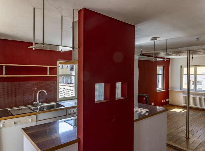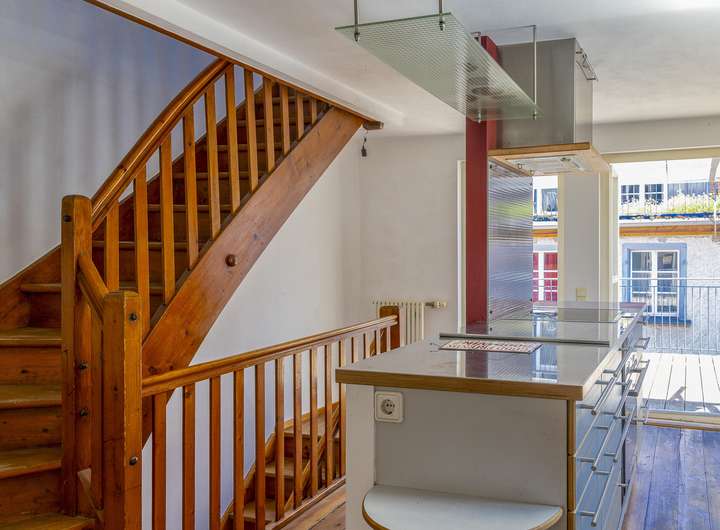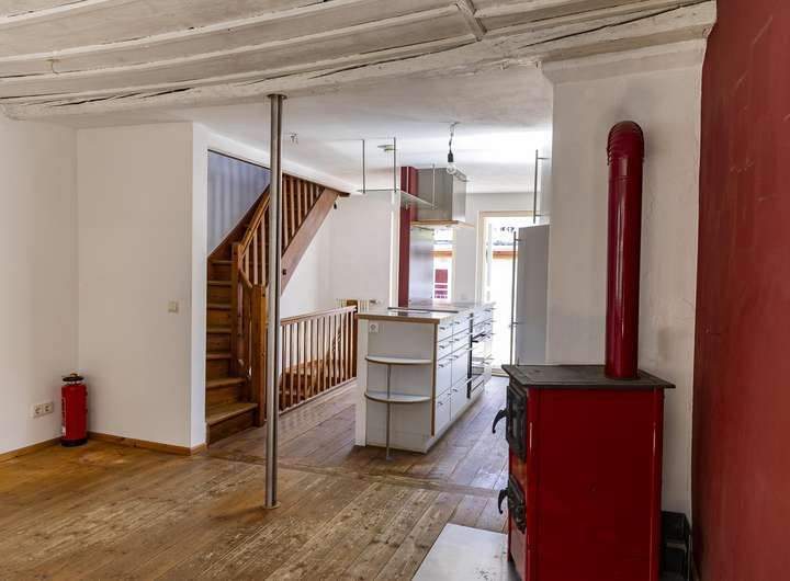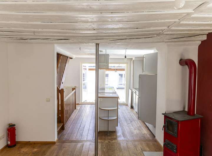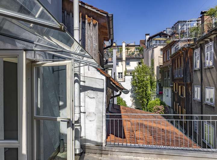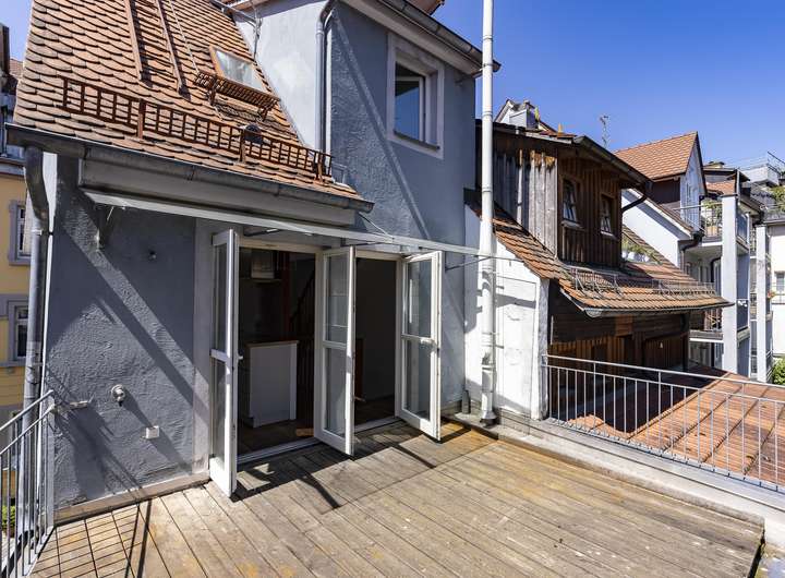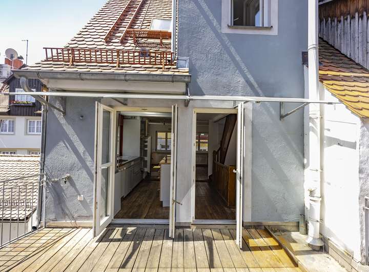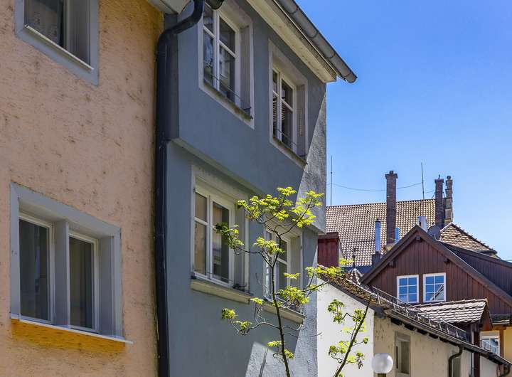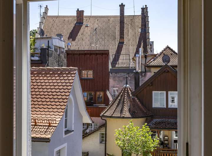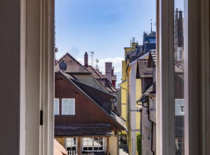 Im 1. Obergeschoss ist das nach hinten und damit sehr ruhig gelegene Schlafzimmer, ein Badezimmer und das Wohnzimmer angeordnet. Der gemütliche Dielenboden und der Ofen verbreiten sofort eine heimelige Atmosphäre zum Wohlfühlen. Spätestens eine Etage höher haben Sie sich bereits verliebt in ihr neues Domizil. Diese Etage mit der Einbauküche mit direktem Zugang zur Dachterrasse und dem Essbereich hat loftartigen Charakter und durch die Sonneneinstrahlung geradezu eine sphärische Schönheit. Die große Dachterrasse mit Blick auf die umliegenden Inselhäuser und die Gasse ist das sonnige Highlight und in den Sommermonaten mit Sicherheit Ihr zweites Wohnzimmer und Ihr neuer Lieblingsplatz sehr nah am Bodensee.