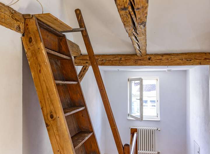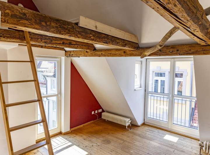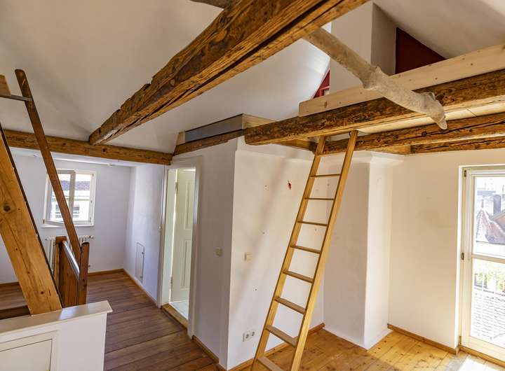 Im 3. Obergeschoss befindet sich weiterer Wohnraum und ein Badezimmer. Charakteristisch sind hier die schönen Holzbalken und die spannende Architektur mit unendlichen Gestaltungsmöglichkeiten.