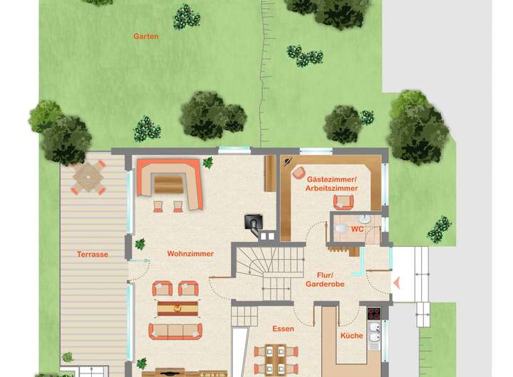 Ein praktischer Abstellraum für Gartengeräte und Grill befindet sich unterhalb der Garage (eben zum Garten). Ein Traum für jede Familie!
