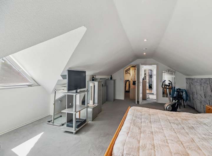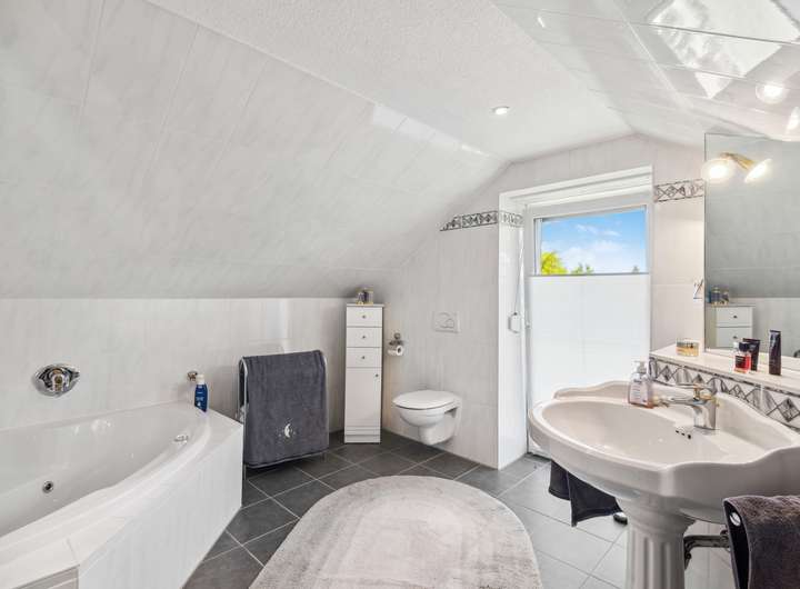 Im Obergeschoss befinden sich zwei komfortable Zimmer, die als Rückzugsorte zur Erholung einladen. Außerdem gibt es ein drittes, großzügiges Badezimmer, das eine optimale Nutzung des oberen Bereichs gewährleistet.
