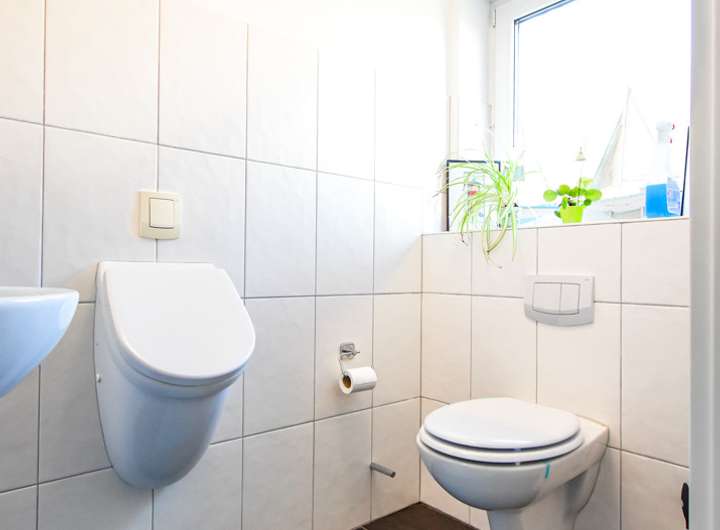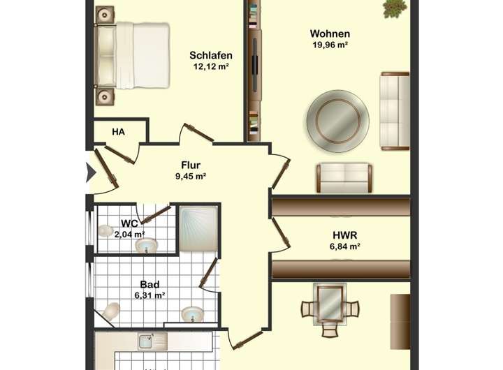 Flur, Küche mit Esszimmer - Zugang zur Terrasse, Wohnzimmer - Zugang zur 2. Terrasse, Schlafzimmer, Tageslichtbad mit Dusche und WC, HWR, Gäste-WC mit Urinal