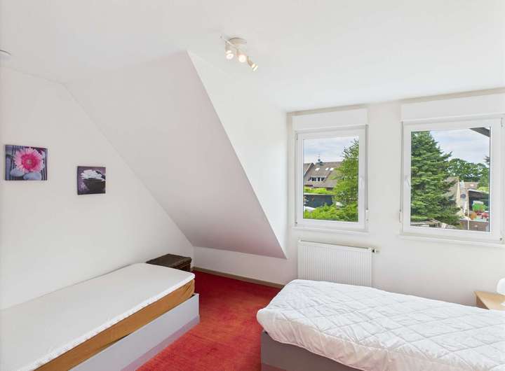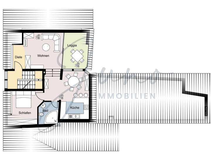 Auch das Dachgeschoss beherbergt eine großzügige Wohneinheit von 63 m² mit 2 gemütlichen Zimmern und einer offen, modernen Küche und ein Badezimmer mit Dusche. Das besondere Highlight dieser lichtdurchfluteten Wohnung ist der ausgebaute Dachboden mit separatem WC, den Sie als Arbeitszimmer oder Homeoffice nutzen können und über eine Holztreppe begehen können. Diese Variante einer Maisonette - Wohnung verleiht den Räumen eine warme und gemütliche Atmosphäre. Auch die dazu gehörende Loggia , ebenfalls zur Südseite ausgerichtet, bietet Ihnen viel Wohnkomfort.