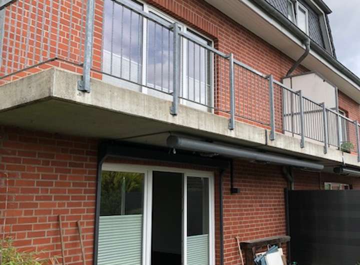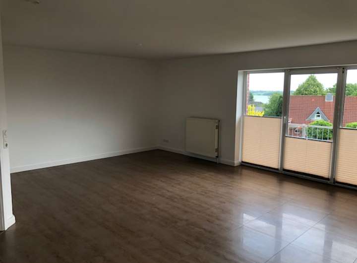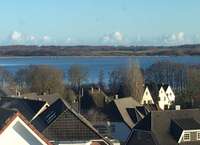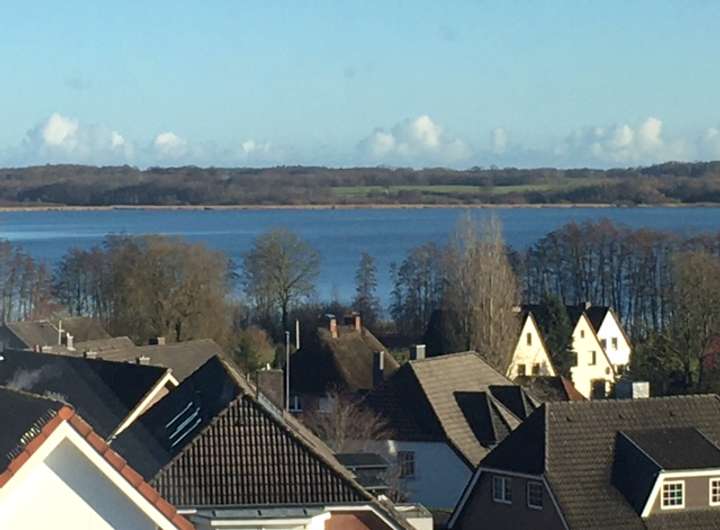 Vom Wohnzimmer gelangt man auf den ca. 8 m breiten Balkon mit Sicht auf den Hemmelsdorfer See sowie in grüne gepflegte Gärten.