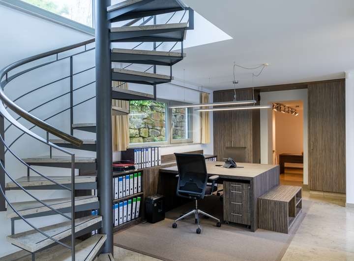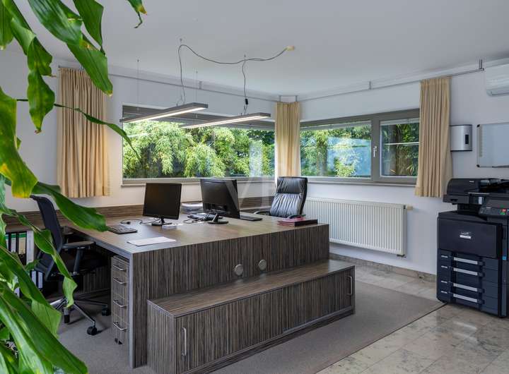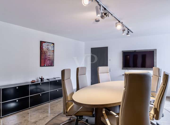 Haus 2 verfügt über eine identisch luxuriöse Austattungsqualität wie Haus 1, ist jedoch zusätzlich voll klimatisiert und mit Radiatorenheizung ausgestattet. Es bietet eine multifunktionale Nutzungsmöglichkeit als Büro auf beiden Etagen mit Empfang und Besprechungsraum auf der Erdgeschoßebene, oder z. B. Teilnutzung zu Wohnzwecken auf der oberen Etage. Die Terrasse auf der oberen Ebene an der Gästezimmereinheit ermöglicht kurze Wege zu Haus 1.
