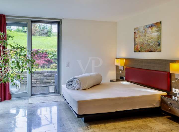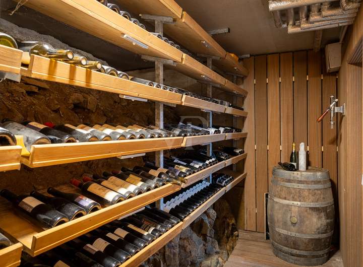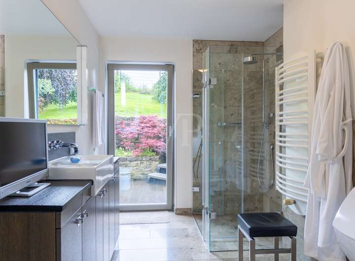 Das Haupthaus selbst erstreckt sich über drei Ebenen und bietet eine gut durchdachte Raumaufteilung. Über das moderne und großzügige Erdgeschoß, mit großer Garderobe und Einbauschränken, Weinkeller, Heizungsraum und Gäste WC gelangen Sie in das Herz der Immobilie. Von hier haben sie ebenfalls unmittelbar Zugang zur Garage. Im 1. Obergeschoß befindet sich ein offener Wohn- und Essbereich mit freistehendem Küchenblock und Kamin und direktem Zugang zu einer großzügigen Terrasse. Die Südwestlage der Terrasse gestattet es, viele Sonnenstunden im Freien zu genießen. Die Küche ist hochwertig modern ausgestattet und bietet ausreichend Platz für einen gemütlichen Essbereich. Im 1. Obergeschoß befinden sich zudem ein praktischer Hauswirtschaftsraum, bzw. die Vorküche und ein Bad. Ein zusätzlicher Raum, der für die Saunanutzung ideal wäre, befindet sich ebenfalls auf dieser Ebene.