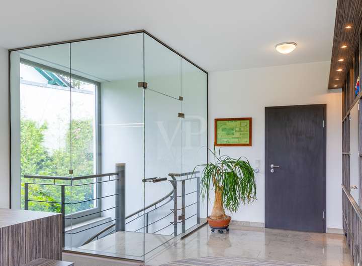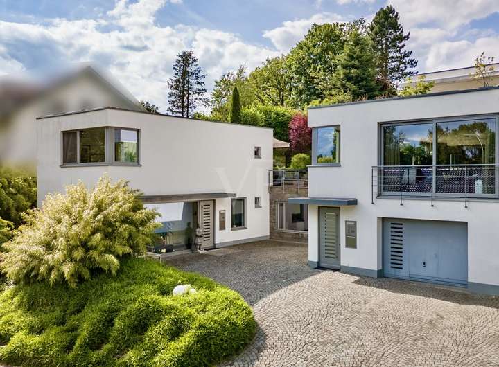 Zum Verkauf steht ein einzigartiges Ensemble mit zwei separaten Häusern, die 2004 im zeitlosen Bauhausstil errichtet und zuletzt 2017 umfangreich modernisiert wurde. Die Immobilie bietet ein großzügiges Grundstück, bestehend aus zwei Parzellen mit einer Gesamtfläche von 1.050 m². Die Lage des Grundstücks ist von leichter bis mäßiger Hanglage geprägt und wurde parkähnlich angelegt. Die Ausrichtung nach Südwesten sorgt für eine hervorragende Besonnung. Der Zugang zur Immobilie erfolgt über eine ruhige Sackgasse, die Privatsphäre und minimalen Verkehr garantiert.