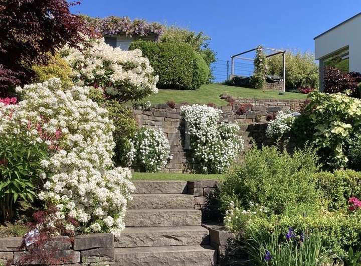 Die Zufahrt führt über eine ansprechend gepflasterte Hoffläche aus Kopfsteinpflaster, Material Grauwacke, auf der sich zwei PKW-Stellplätze sowie eine Garage befinden. Für zusätzlichen Komfort sorgt eine zuschaltbare Terrassenheizung, die auch an frostigen Tagen einen schneefreien Zugang gewährleistet. Ein Brunnen mit einer Tiefe von 38 Metern steht zur Gartenbewässerung zur Verfügung und ist zudem für die Nutzung von Erdwärme geeignet.