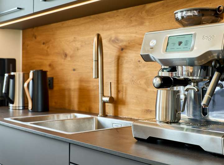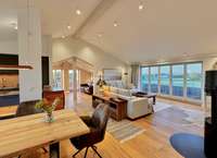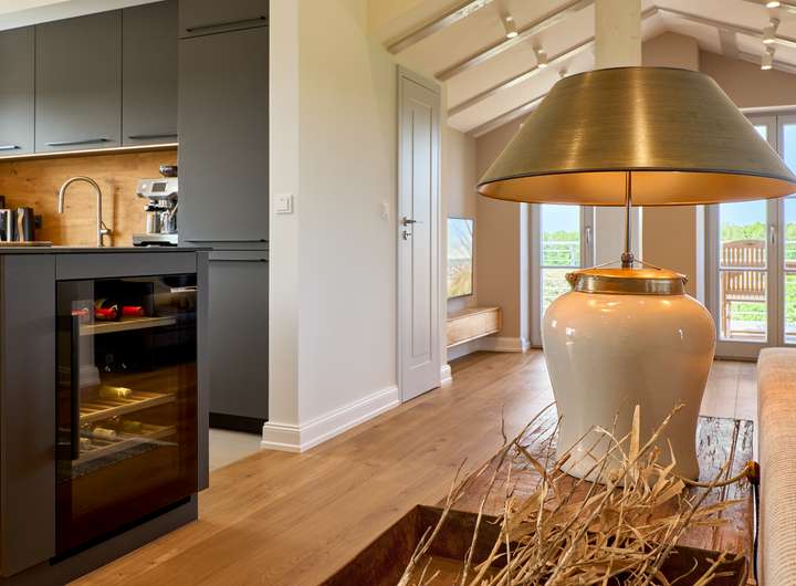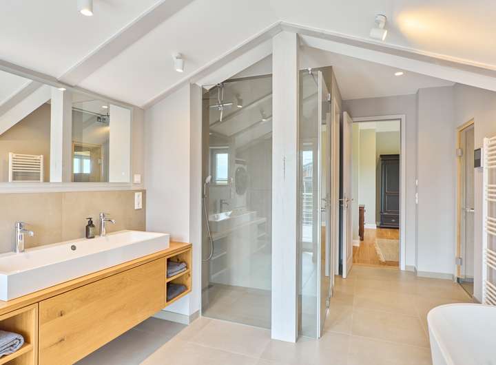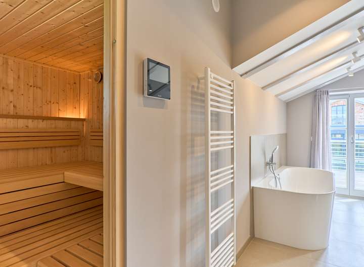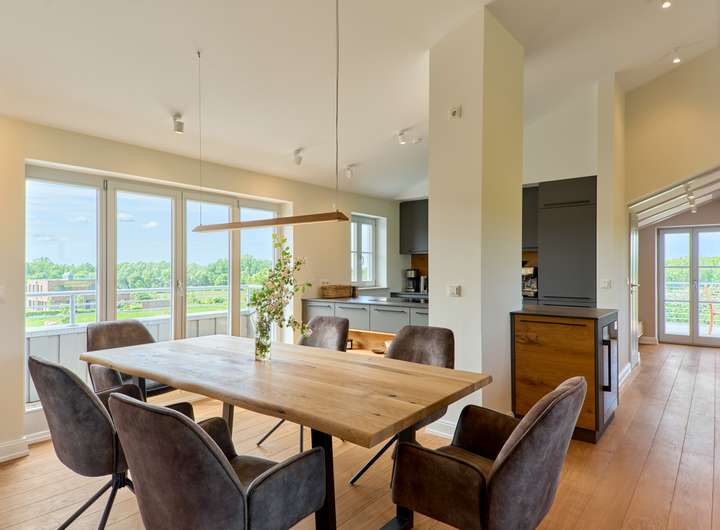 Loftwohnraum 66 qm, 2 Dachterrassen, 4 Balkone, Kaminofen, tischlergefertigte Küche mit Weinkühlschrank, 2 Schlafzimmer mit eigenen Bädern, zusätzlich Gäste-WC, Sauna mit Blick bis zur Ostsee, alle Wohnräume mit Eichendielen, auf Wunsch möbliert, in den Bädern großformatige Fliesen von Coonen, Casambi-Lichtinstallation. Sonos-Hifi, beheizter 13 Meter-Pool mit Gegenstromanlage