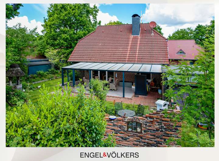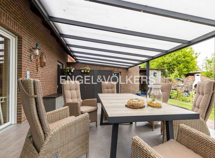 Ein besonderes Highlight ist der großzügige, überdachte und windgeschützte Terrassenbereich, der in den liebevoll angelegten, bereits eingewachsenen Garten mit altem Baumbestand übergeht. Hier finden sich auch ein einladender Grillplatz sowie viel Platz zum Entspannen oder Spielen.