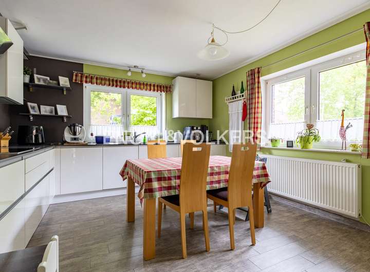 Herzstück des Hauses ist das gemütliche Wohnzimmer mit Kamin, das an kalten Tagen eine behagliche Atmosphäre schafft. Die hochwertig ausgestattete Einbauküche lässt keine Wünsche offen und fügt sich harmonisch in den Wohnbereich ein.