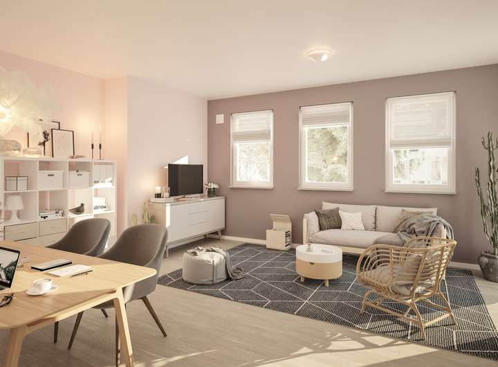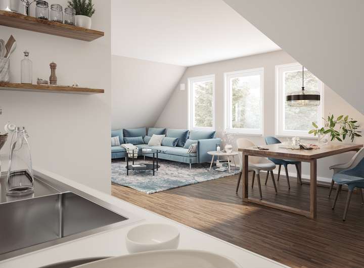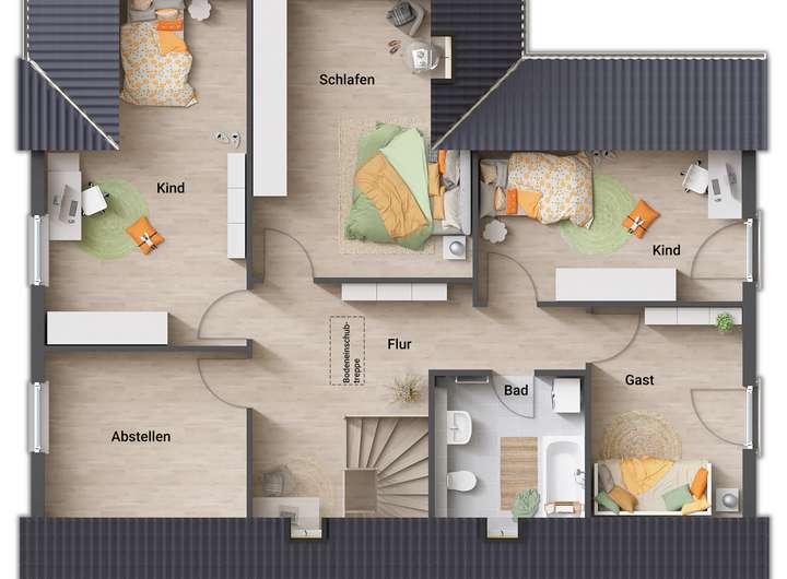 Im Erdgeschoss wartet ein offen gestalteter Wohn- und Essbereich mit großen Fensterflächen und Zugang zur Terrasse auf dich. Die luftige Raumwirkung lädt zum Wohlfühlen ein – ob bei einem geselligen Abend mit der Familie oder einem ruhigen Moment im Grünen. Schlafzimmer, Kinderzimmer und Gästezimmer sind ebenfalls im Erdgeschoss untergebracht – viele davon mit direktem Gartenzugang. Besonders charmant: Der überdachte Winkel verbindet Innen- und Außenbereich auf elegante Weise.