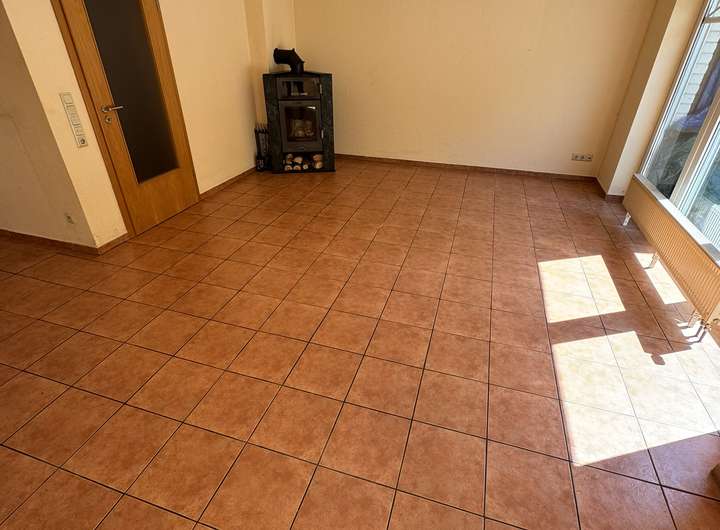 Im Wohnzimmer ist ein Kaminofen verbaut.