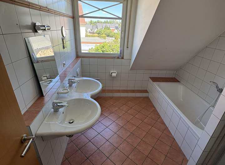 Im Obergeschoss befinden sich zwei Schlafzimmer und ein Bad mit Dusche und Badewanne.