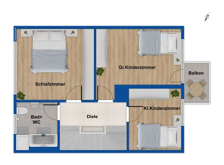 Das Obergeschoss bietet drei gut geschnittene Schlafzimmer, ein Tageslichtbad und einen kleinen Balkon mit Blick in den Garten.