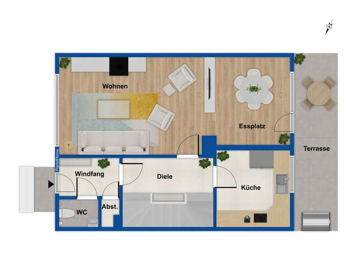 Im Erdgeschoss befinden sich ein Windfang mit Zugang zu Gäste-WC und Abstellraum, eine Küche mit Gestaltungsspielraum sowie ein großzügiger Wohn- und Essbereich mit direktem Zugang in den Garten.