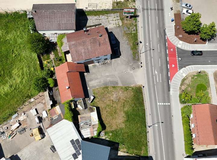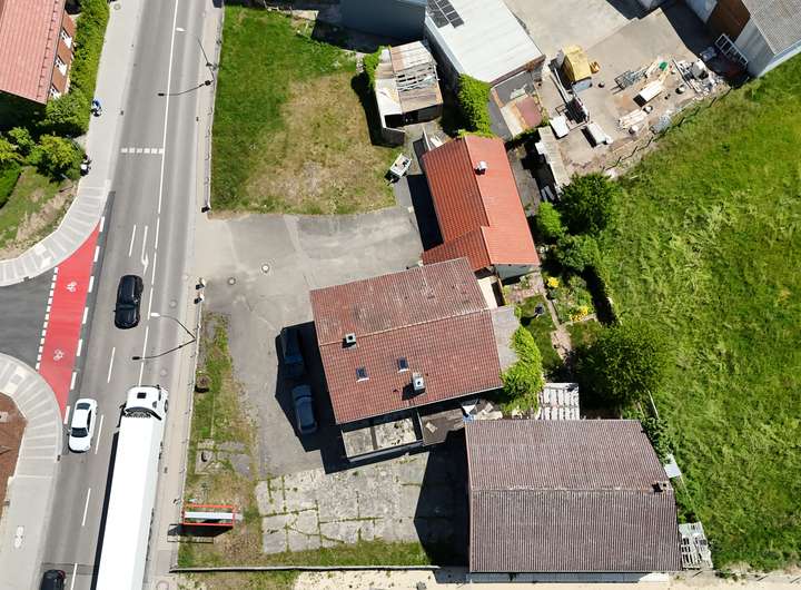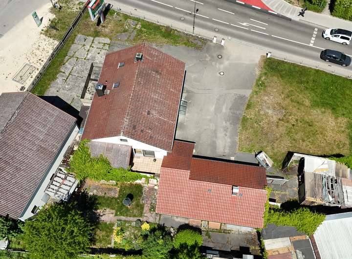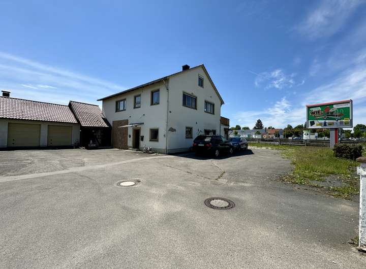 Aktuell ist das Grundstück mit einem großen Wohnhaus, mit mehreren Garagen in EG, einer großen LKW-Doppelgarage mit Dachboden und einer Dreifachgarage bebaut, die im Zuge der Neubebauung abgerissen werden müssten. Eine Werbetafel befindet sich ebenfalls auf dem Grundstück und erwirtschaftet einen Mietertrag. Der Vertrag läuft noch bis 2030, könnte aber bei einer Neubebauung gekündigt werden.