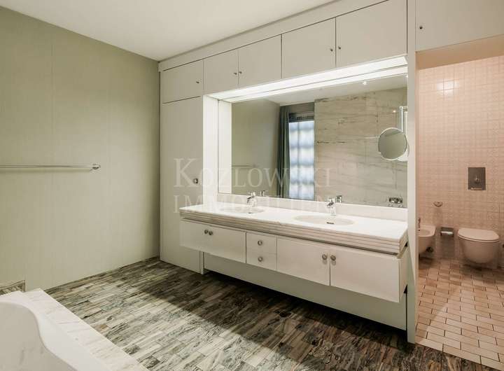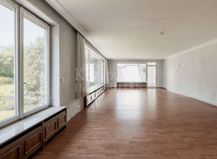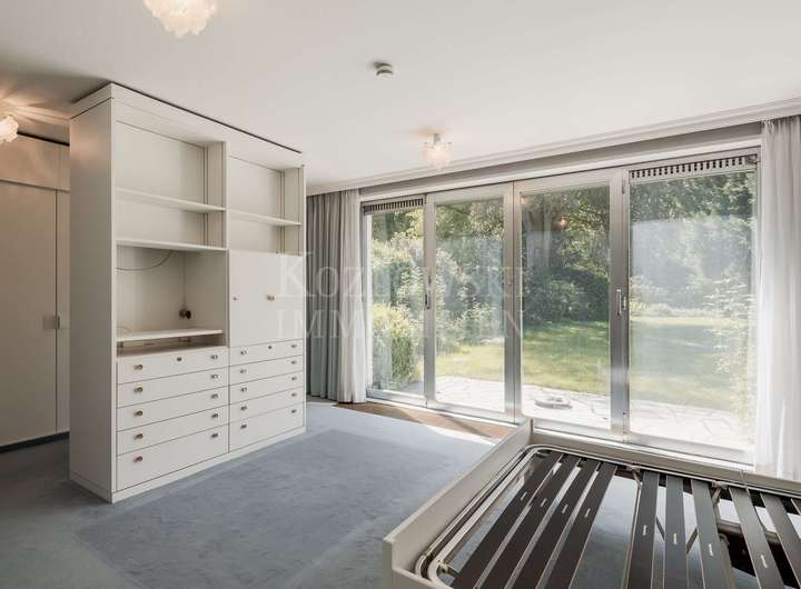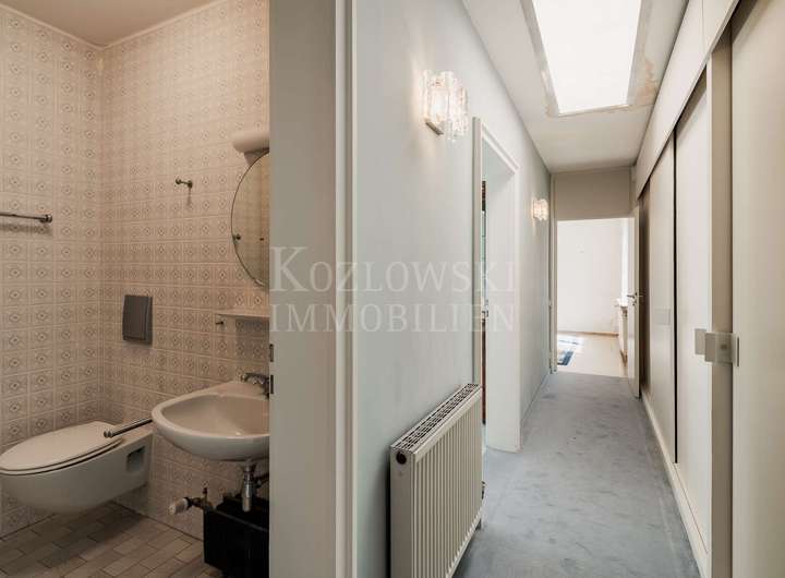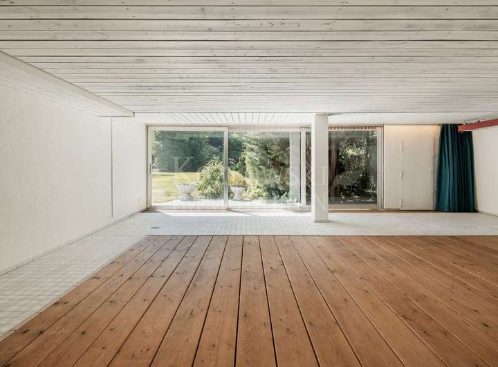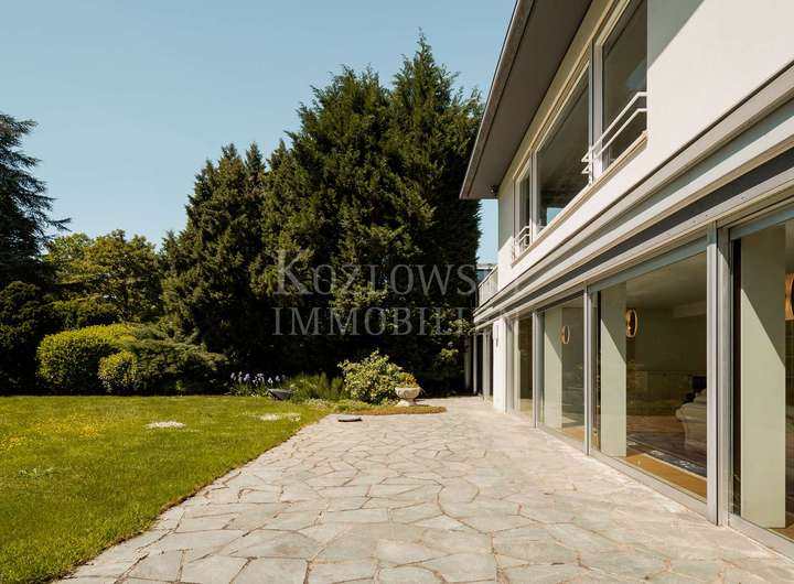 Aktuell ist das Anwesen in zwei separate Einheiten mit eigenen Hauseingängen und Treppenhäusern unterteilt. Die erste Einheit rechts erstreckt sich über das Erd- und Dachgeschoss. Das Erdgeschoss, mit ca. 156 qm, beeindruckt mit einem weitläufigen Wohnbereich samt Glasfront und Zugang zur Sonnenterrasse mit Blick in den herrlichen Garten. Zwei Schlafzimmer, ein Tageslichtbad, ein Gäste-WC sowie eine Wohnküche mit Hauswirtschaftsraum ergänzen diese Ebene. Das Dachgeschoss (ca. 55 qm) bietet drei weitere Zimmer und ein WC - ideal als Kinder-, Gäste- oder Homeoffice-Bereich. Das Gartengeschoss erschließt sich Ihnen über den linken Hauseingang und ist über das Treppenhaus oder barrierefrei per Aufzug erreichbar. Auf ca. 337 qm erwarten Sie ein sehr großzügiger Wohnbereich mit Panoramaverglasung, Kamin und direktem Zugang zum traumhaften Garten mit altem Baumbestand und hoher Privatsphäre - ideale Voraussetzungen für den Bau eines exklusiven Außenpools. Angrenzend befinden sich das Esszimmer mit gemütlicher Stube, eine Küche mit Technikraum, ein Gäste-WC sowie ein uriger Bar-Bereich, über welchen Sie den Wellnessbereich mit stillgelegtem Indoor-Pool, Sauna, Dusche und Umkleide erreichen. Die privaten Räume in einem separaten Trakt bieten ein Schlafzimmer mit Terrassenzugang, ein Badezimmer sowie den Masterbedroom mit en Suite Bad.
