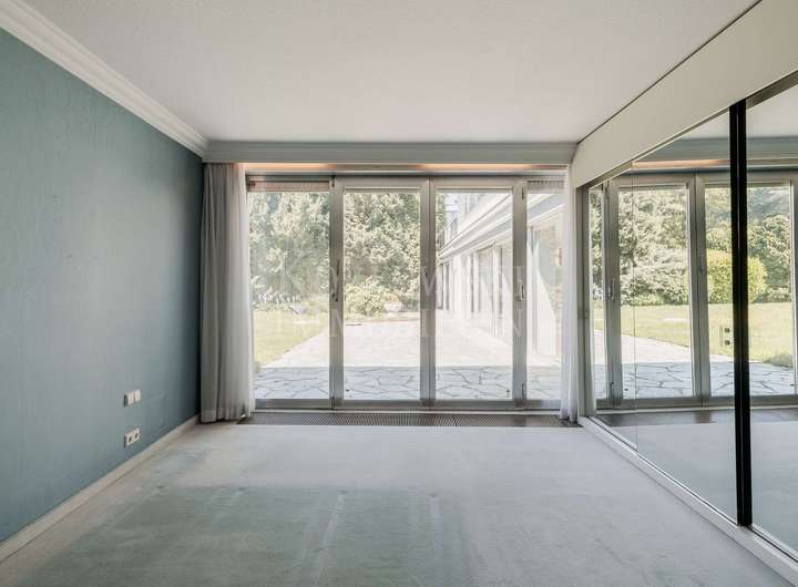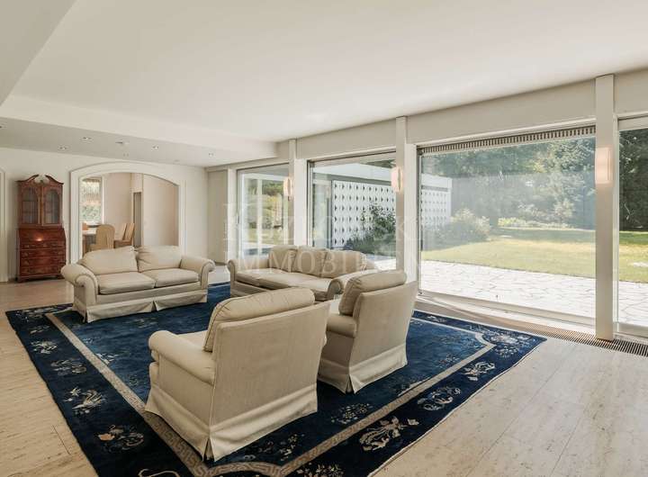 • Sehr großzügiger und eleganter Wohnbereich mit offenem Kamin, Bibliothek und Zugang zur großen Garten-Terrasse und Sonnengarten im Gartengeschoss